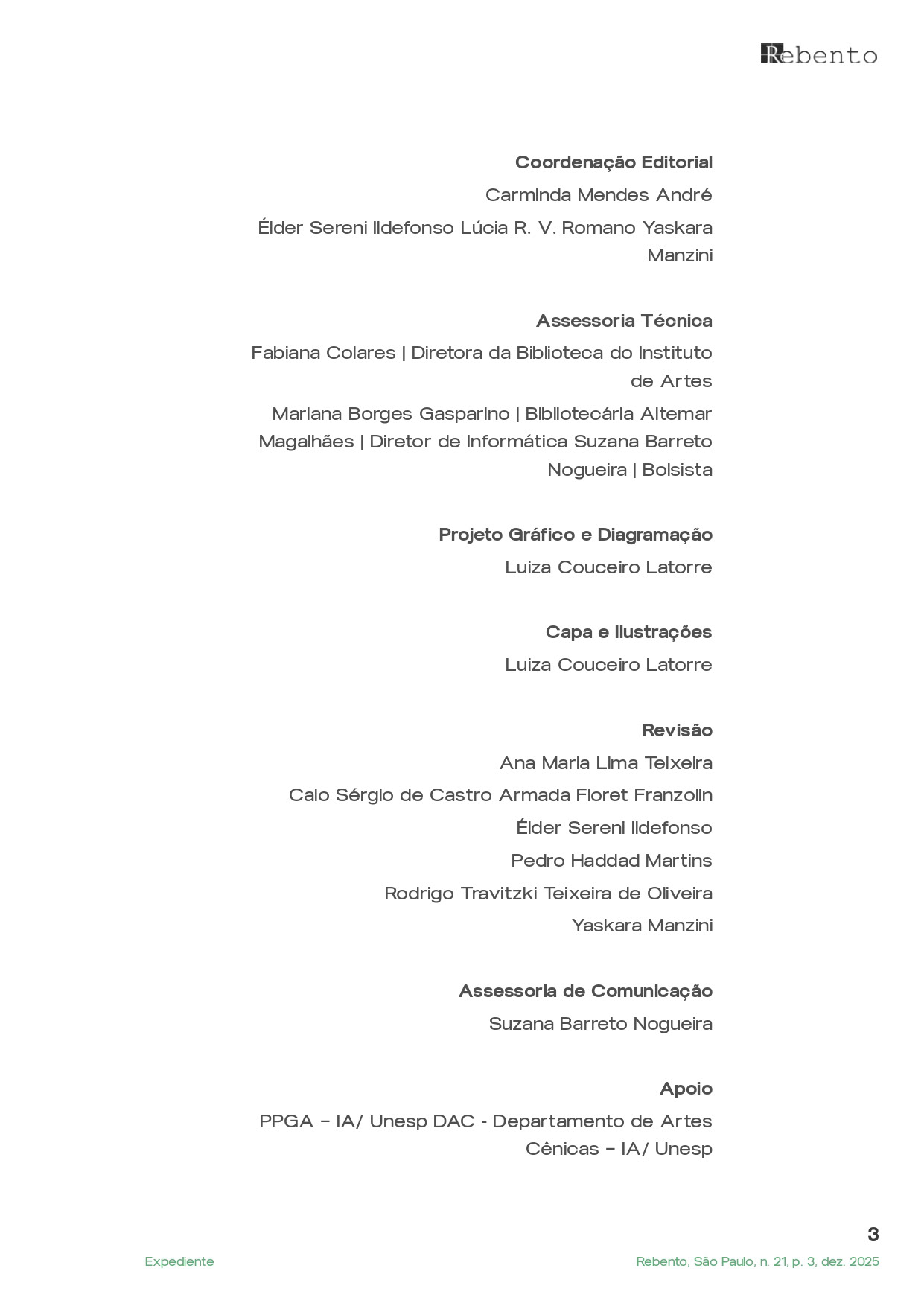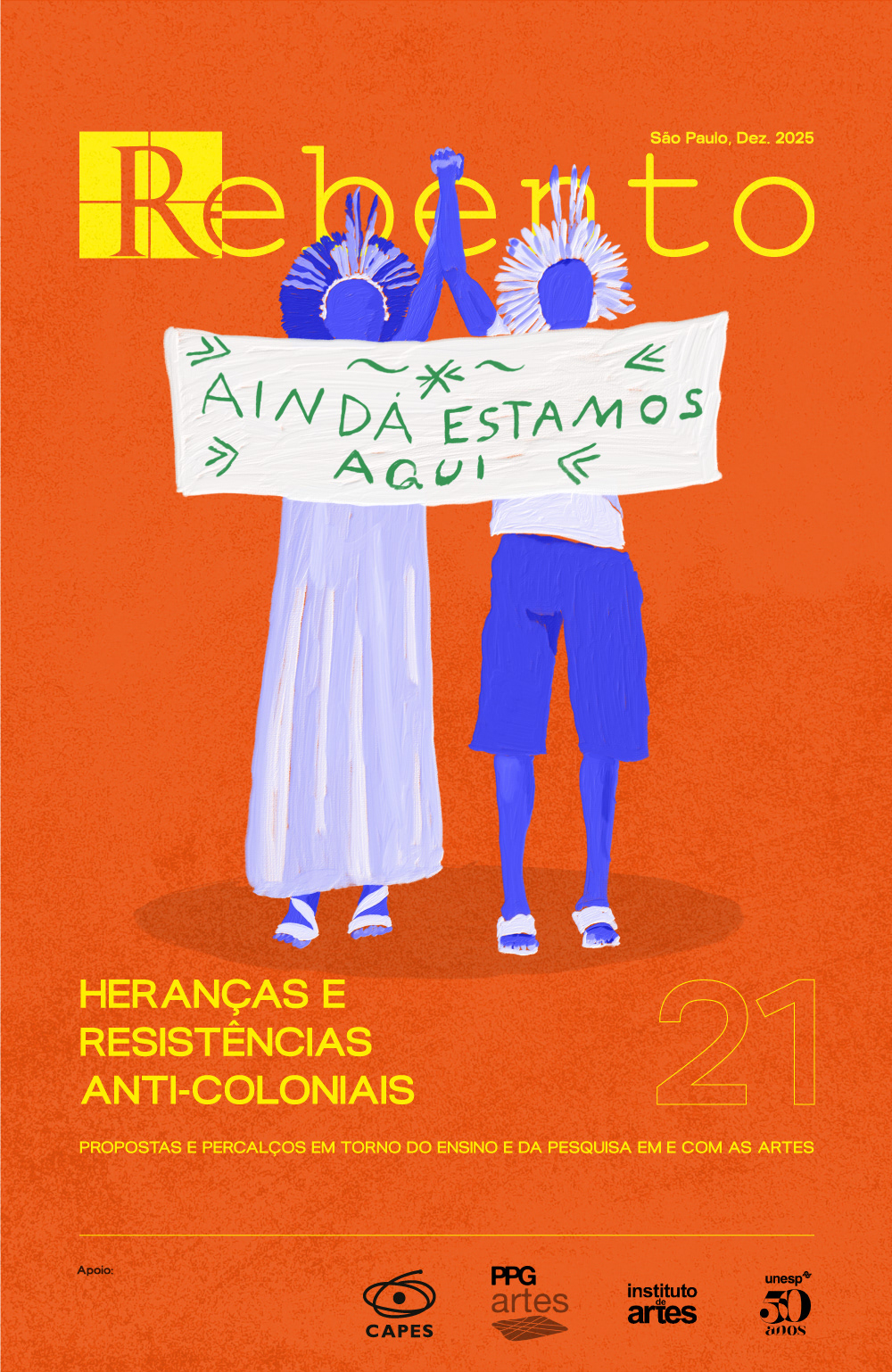 Diagramação e ilustração de capa para a Revista Rebento, edição v. 1 n. 21 (2025): Heranças e Resistências Anti-coloniais: propostas e percalços em torno do ensino e da pesquisa em e com as artes.